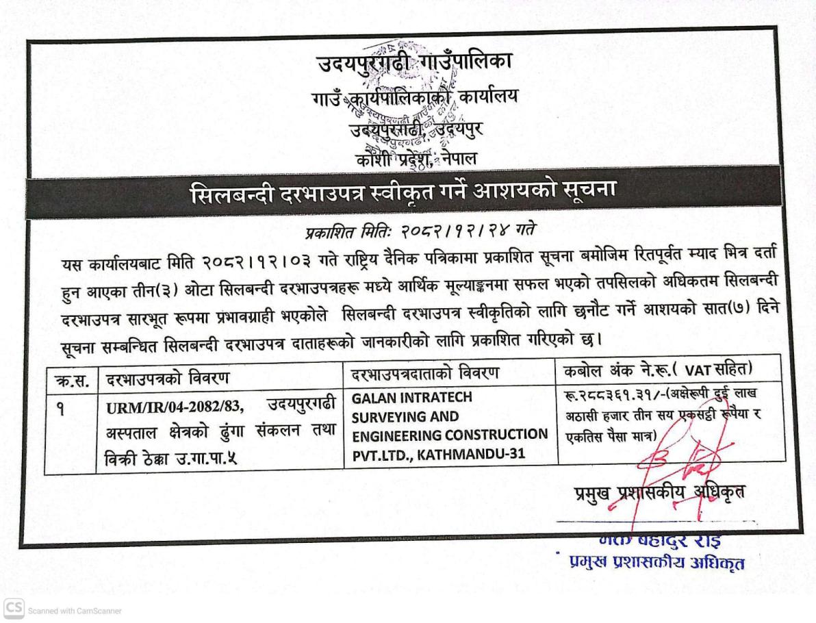 उदयपुरगढी अस्पताल क्षेत्रको ढुंगा संकलन तथा विक्री ठेक्काको शिलबन्दी दरभाउपत्र स्वीकृत गर्ने आशयको सूचना। २०८२-१२-२४
