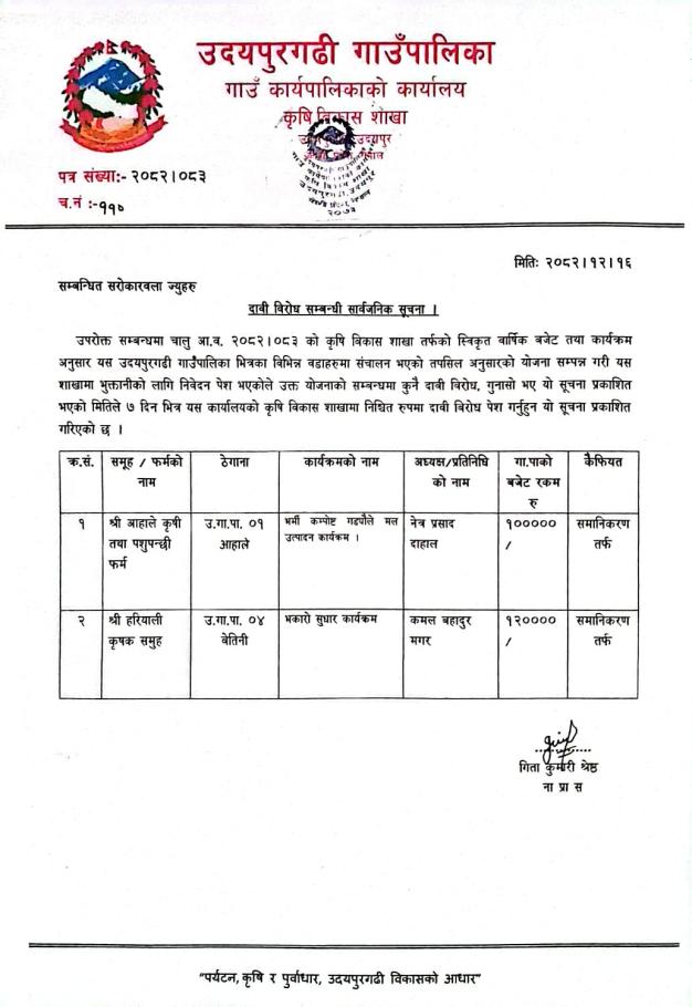 दावी विरोध सम्बन्धी सार्वजनिक सूचना । २०८२-१२-१६