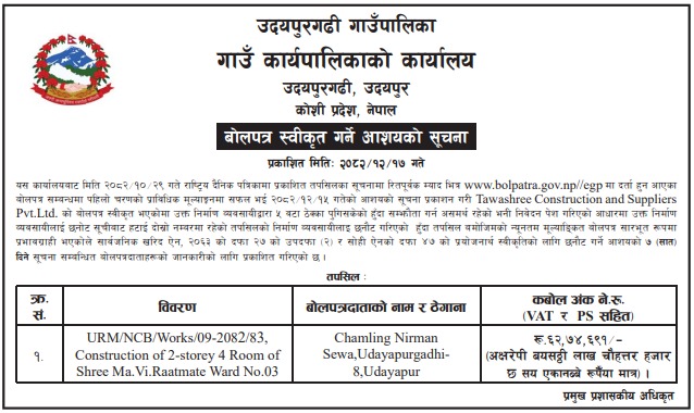 बोलपत्र स्विकृत गर्ने आशयको सूचना । २०८२-१२-१७