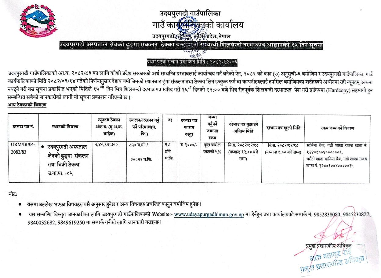 उदयपुरगढी अस्पताल क्षेत्रको ढुङ्गा संकलन ठेक्का बन्दोबस्ती सम्बन्धी शिलबन्दी दरभाउपत्र आह्वानको १५ दिने सूचना ।