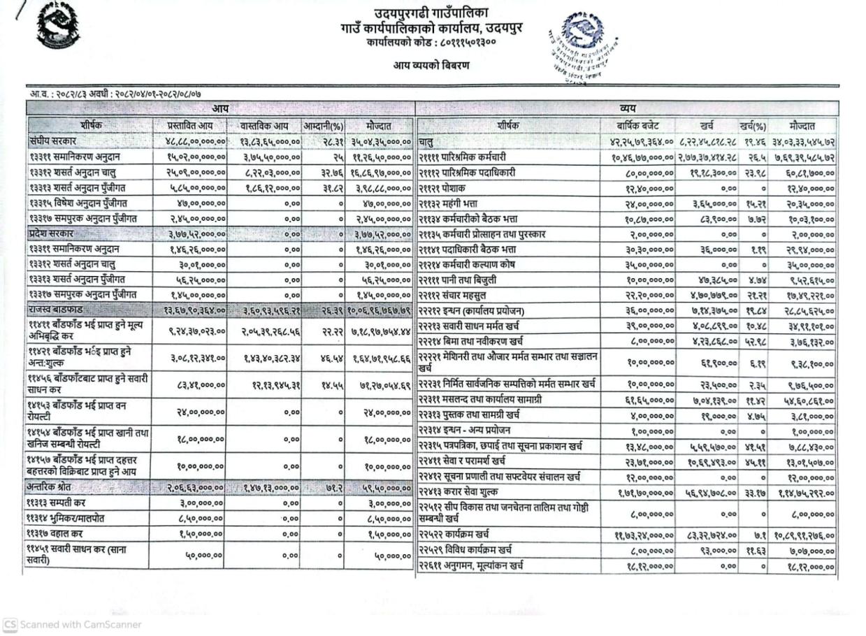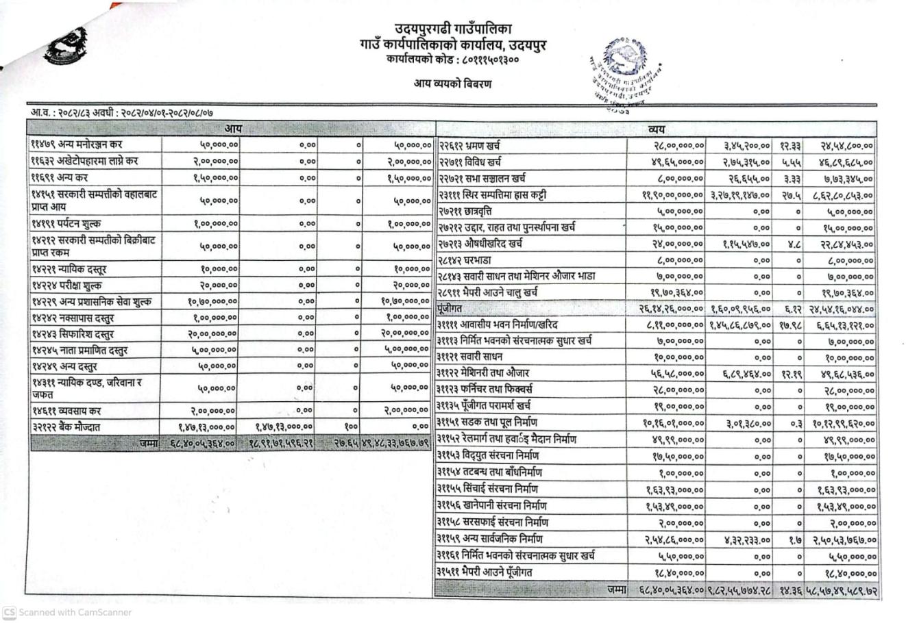 उदयपुरगढी गा.पा. को आय व्यय विवरण - २०८२/०८/०७