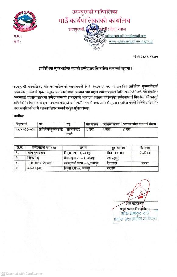 प्राविधिक सुपरभाईजर पदको उम्मेद्वार सिफारिस सम्बन्धी सूचना ।