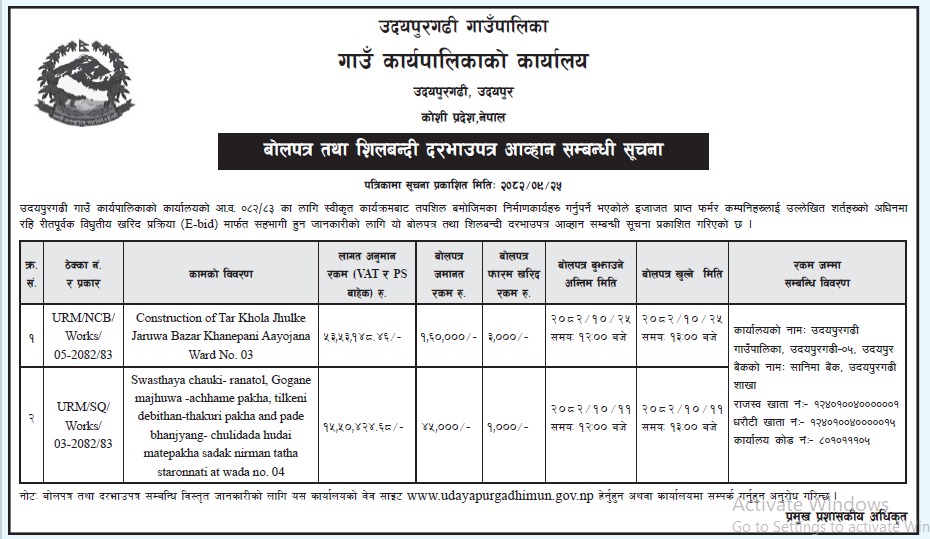 बोलपत्र तथा शिलबन्दी दरभाउपत्र आह्वान सम्बन्धी सूचना । २०८२-०९-२५