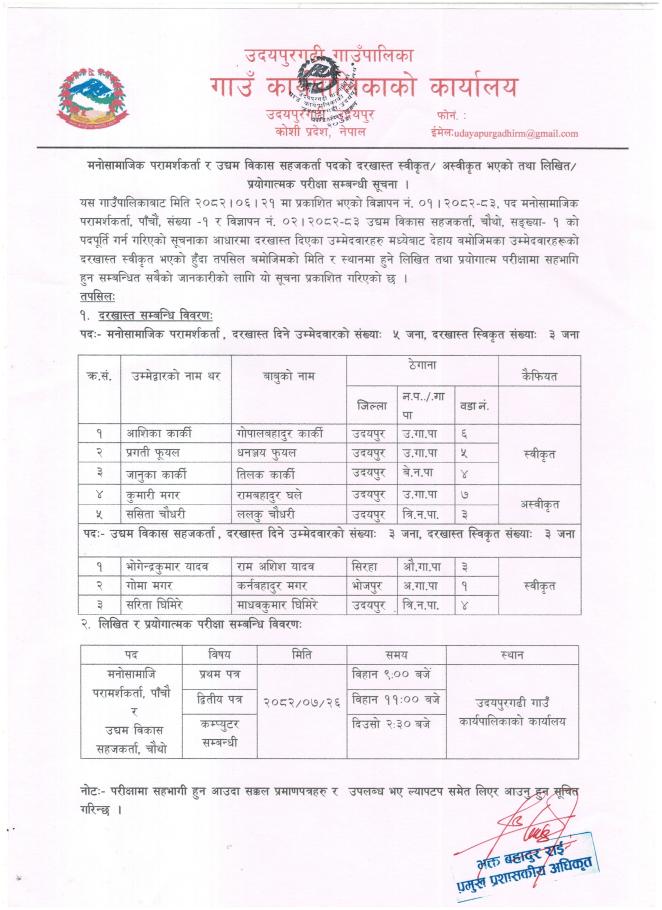 मनोसामाजिक परामर्शकर्ता र उद्यम विकास सहजकर्ताको पदको दरखास्त स्वीकृत / अस्वीकृत भएको तथा लिखत / प्रयोगात्मक परिक्षा सम्बन्धी सूचना ।