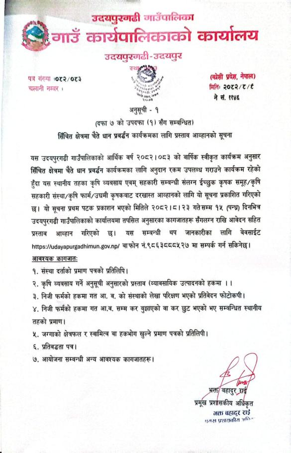 सिंचित क्षेत्रमा चैते धान प्रवर्धनका लागि प्रस्ताव आह्वानको सूचना । २०८२-०८-०९
